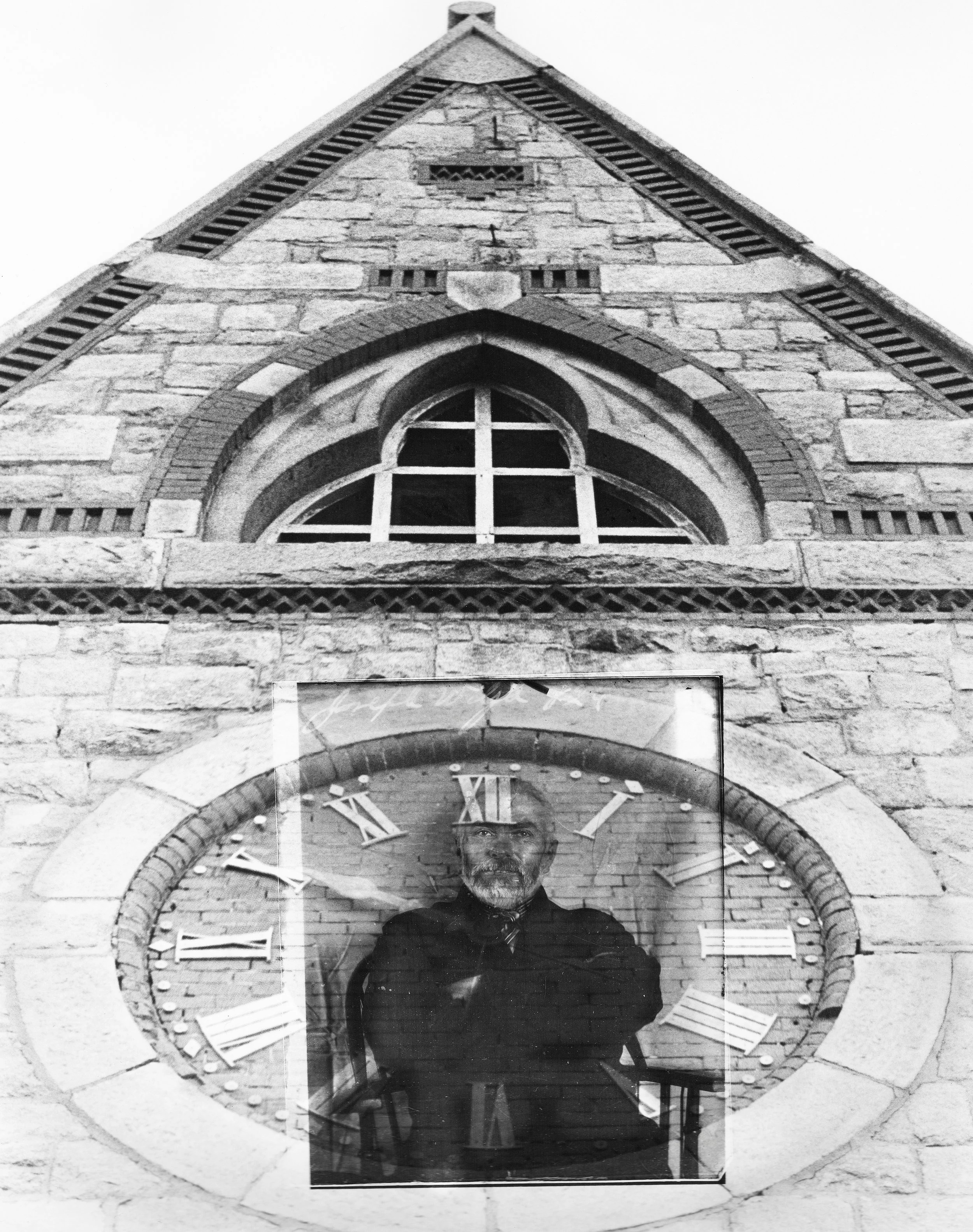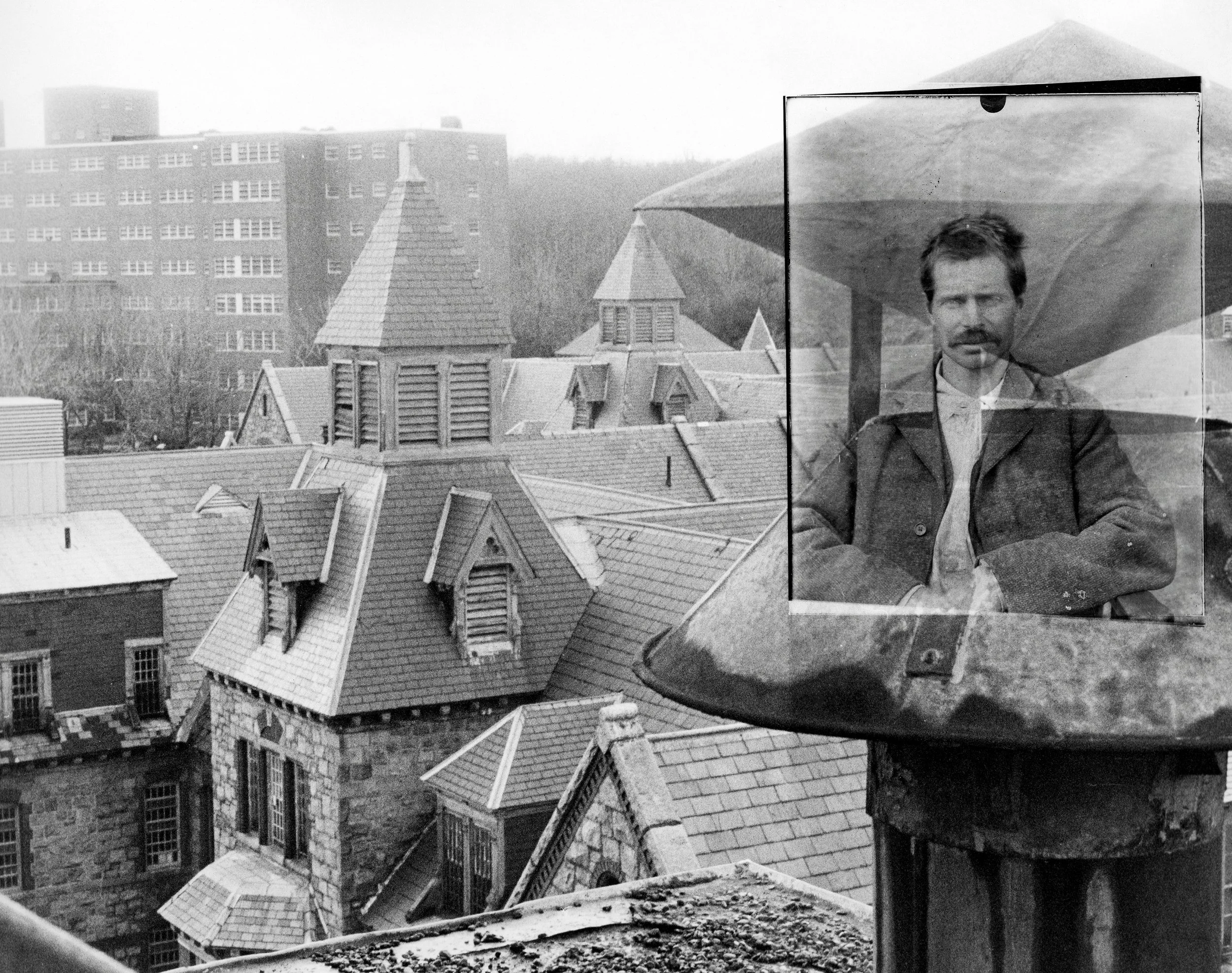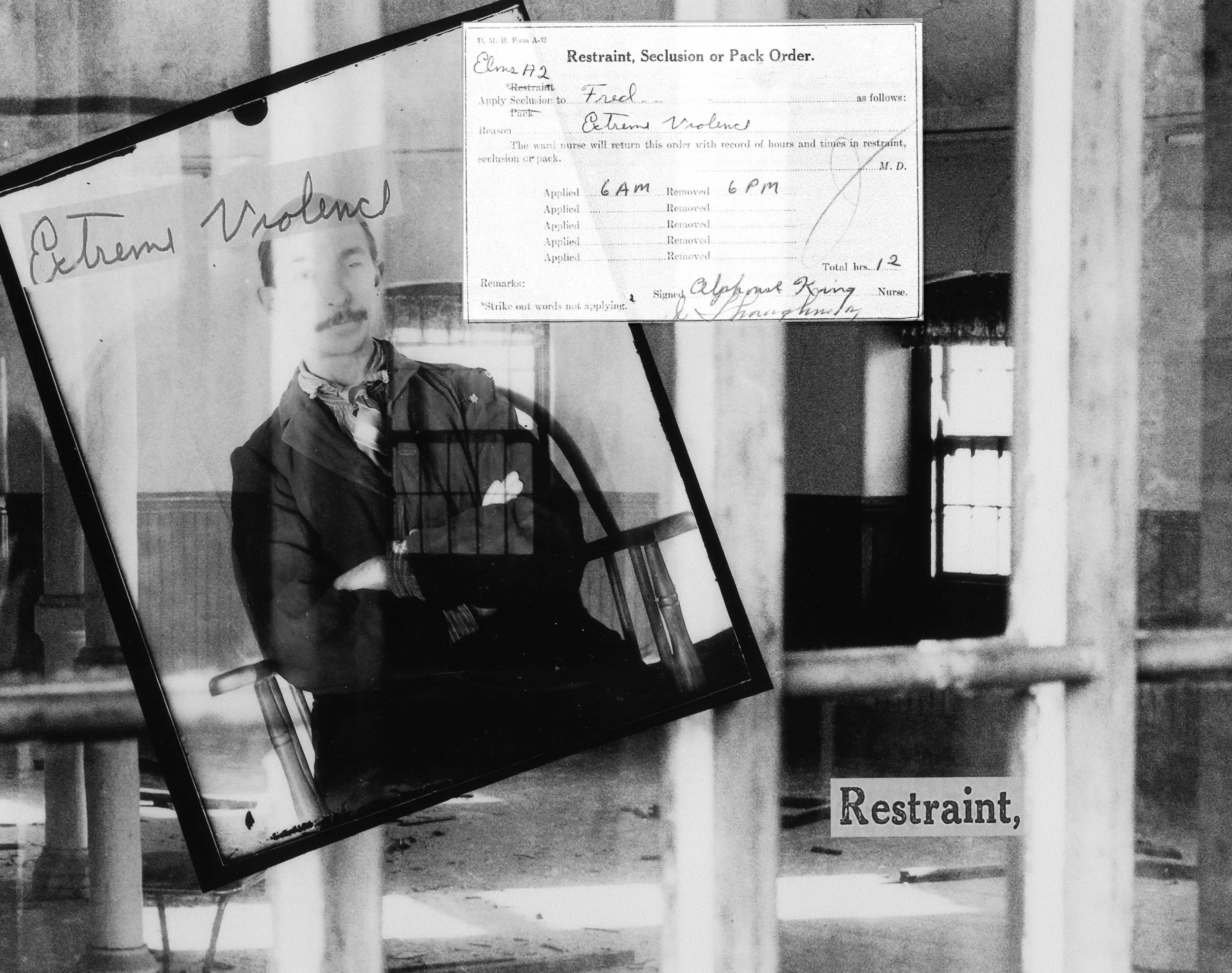 The collage uses discarded glass plate images of patients from Worcester Insane Asylum. They were combined with my own photographs of the abandoned hospital.